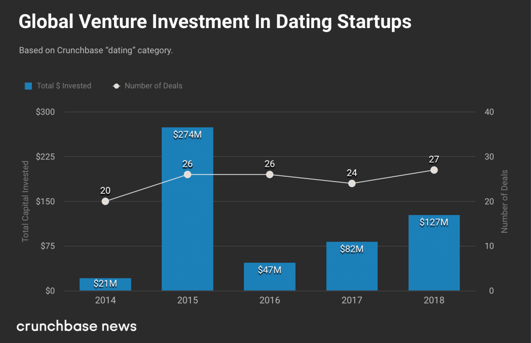 据预测,全球约会市场将在2025年达到35.92亿美元,而回顾这几年来的全球资本流动,约会市场获得的并不多,比如2018年全球仅有27家主打约会的公司获得了1.27亿美元的融资,与当年所有行业共获得的3000亿美元形成鲜明对比。