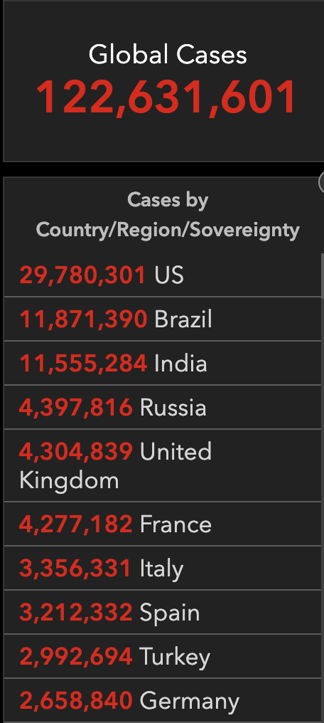 据约翰斯·霍普金斯大学的疫情追踪数据,截至北京时间3月21日上午8点30分,全球累计确诊新冠肺炎病例122631601例,累计死亡2705724例。