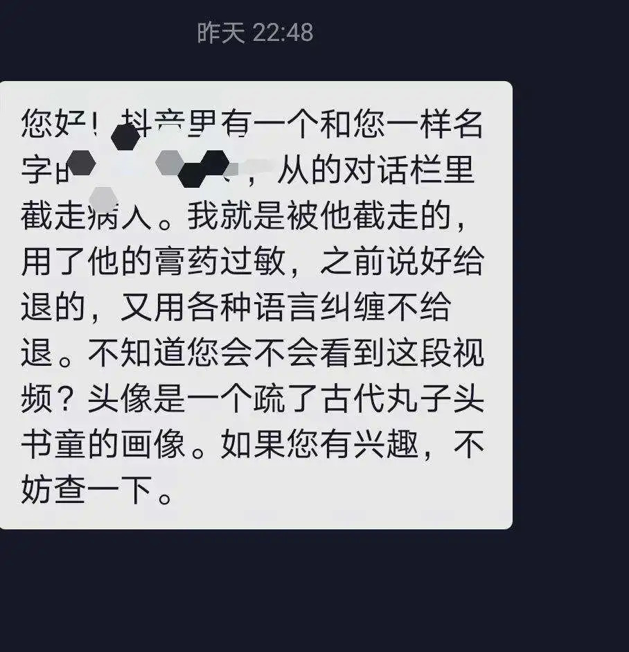 几天前,咖喱亲自下场battle,他发布视频称,平台上有很多人用和他一样的重名账号,在他的评论区截留病人,推荐膏药,收到钱之后就玩消失。他在视频中特别注明,“我不会推荐和推销任何药物、疗法,也不会让大家来找我看病。”