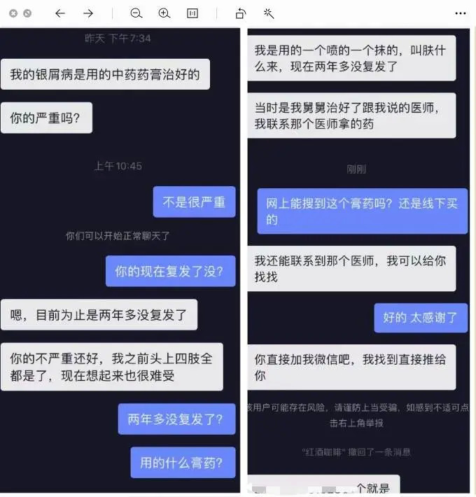 加上微信后,这个网友向开菠萝财经推荐了她口中的医师,并再一次强调:“西药里带着激素,断药就复发,我用这个中药,断药两年多没复发了。”