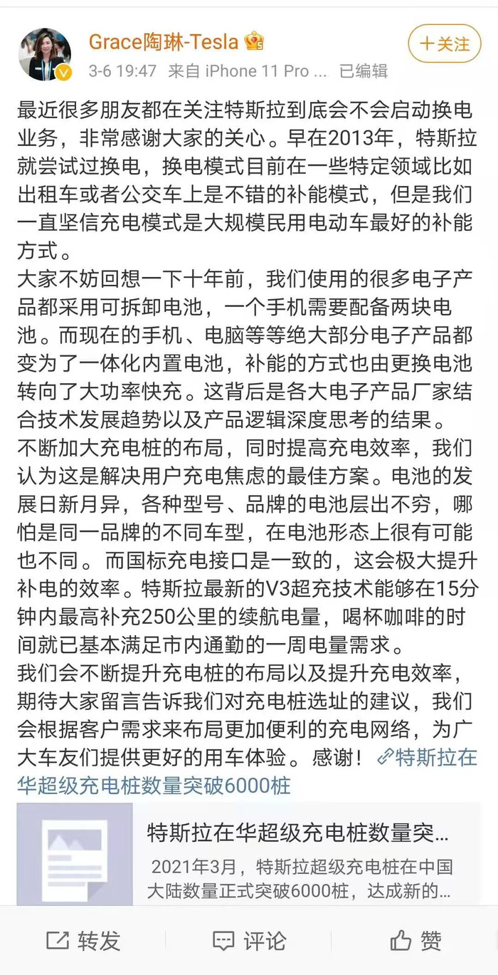 特斯拉全球副总裁陶琳在微博上回应”特斯拉是否会启动换电模式“