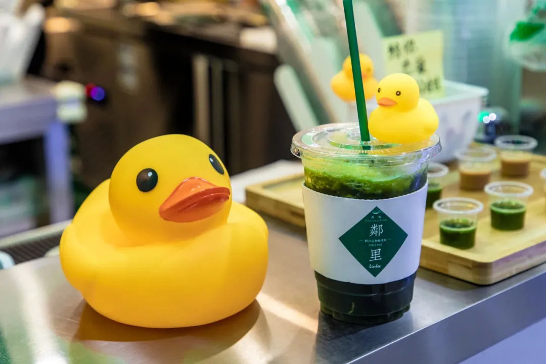 湛江的鄰里手打柠檬茶,凭借一杯“泰绿”以及随茶附赠的小黄鸭玩具成为当地爆款,门店排队、等位都是基本操作。小红书上,也经常看到“原谅绿泰凉柠檬茶+小黄鸭”的拍照套餐。