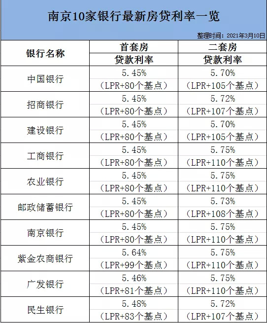 根据界面楼市南京站本月整理的南京10家主流银行房贷利率情况,当前南京首套房主流利率约为5.45%(LPR+80个基点),二套房主流利率约为5.75(LPR+110个基点)。