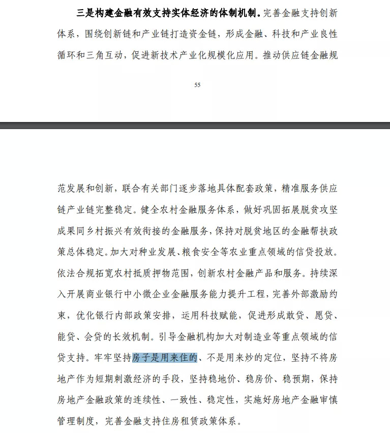对于房地产层面,报告称要牢牢坚持“房子是用来住的、不是用来炒的”定位,坚持不将房地产作为短期刺激经济的手段,坚持稳地价、稳房价、稳预期,保持房地产金融政策的连续性、一致性、稳定性,实施好房地产金融审慎管理制度,完善金融支持住房租赁政策体系。