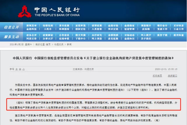 与此同时,2020年12月31日,央行、银保监会发布《关于建立银行业金融机构房地产贷款集中度管理制度的通知》,建立银行业金融机构房地产贷款集中度管理制度,给银行设定了关于房贷规模的“两道红线”。