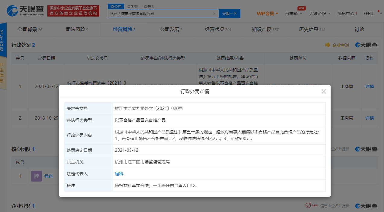 据天眼查APP显示,近日,杭州大奕电子商务有限公司因以不合格产品冒充合格产品,被杭州市江干区市场监督管理局行政处罚,决定文书号为杭江市监委九罚处字〔2021〕020号。处罚内容显示根据《中华人民共和国产品质量法》第五十条的规定,建议对当事人销售以不合格产品冒充合格产品的行为处,责令停止销售不合格产品;没收违法所得242.2元;罚款500元。