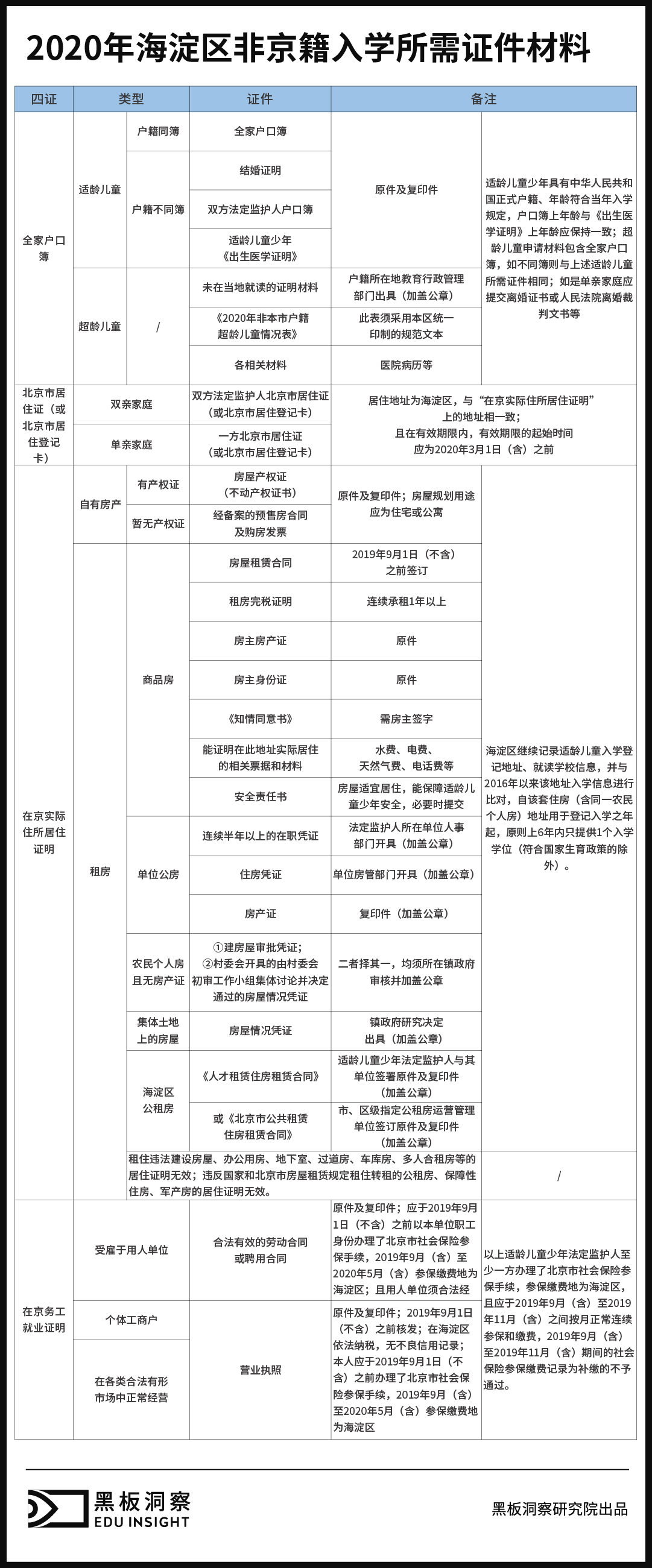 北京户口的学生家长在苦恼自家孩子能否被电脑派位到“优质”小学/初中,而进城务工人员则在担心材料审核能否通过。即使减少到了“四证”,即《全家户口簿》、《北京市居住证(北京市居住登记卡)》、《在京实际住所居住证明》、《在京务工就业证明》,细分项证明却依旧琐碎,各区具体要求不一。以2020年非本市户籍适龄儿童少年在海淀区接受义务教育证明证件材料审核细则为例,具体需要准备的证件竟有如下之多,且有诸多限制条件。例如家庭租住商品房还需提供能证明在此地址实际居住的相关票据和材料,如水费、电费、天然气费、电话费等,还需房主配合签字、提供身份证等等。