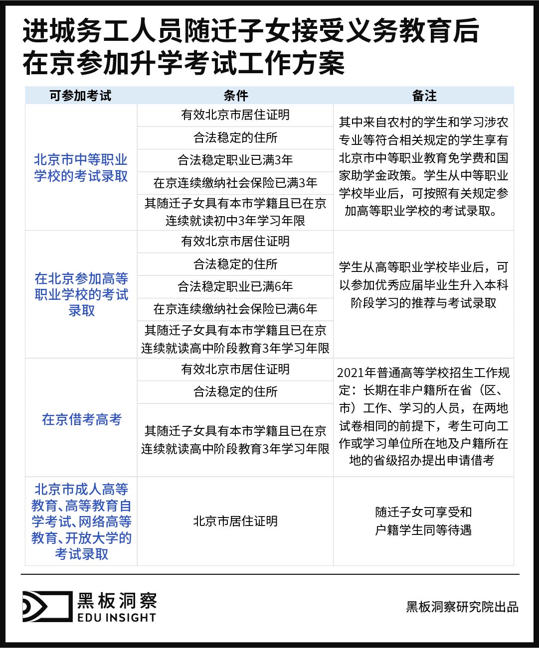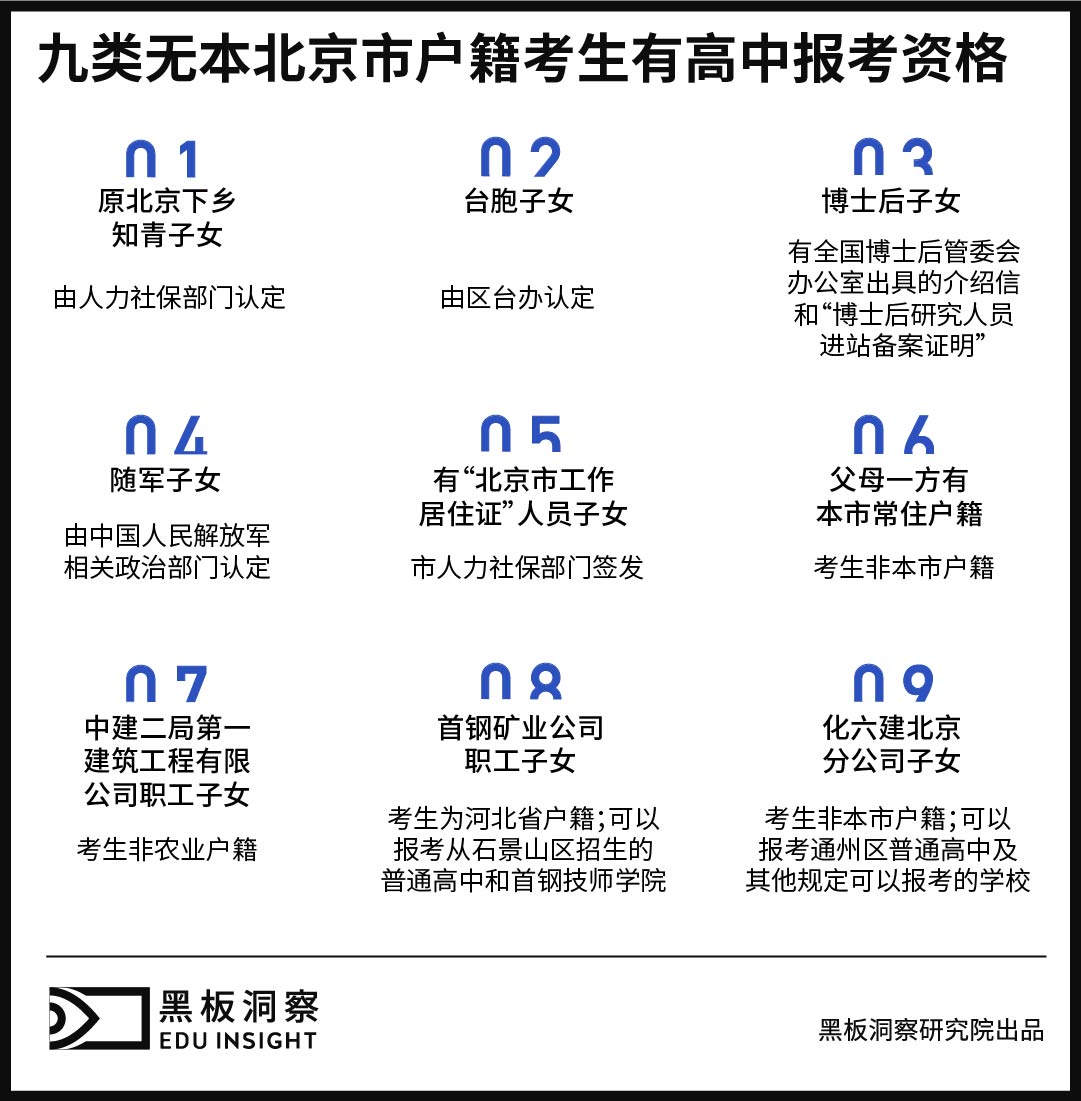 满足上述九类考生的随迁子女少之又少,这就意味着,随迁子女难以在北京上普通高中。为了解决随迁子女在京升学问题,2012年,北京市出台《进城务工人员随迁子女接受义务教育后在京参加升学考试工作方案》,明确满足条件的随迁子女可在京参加中职、高职招生考试录取或在京借考高考。