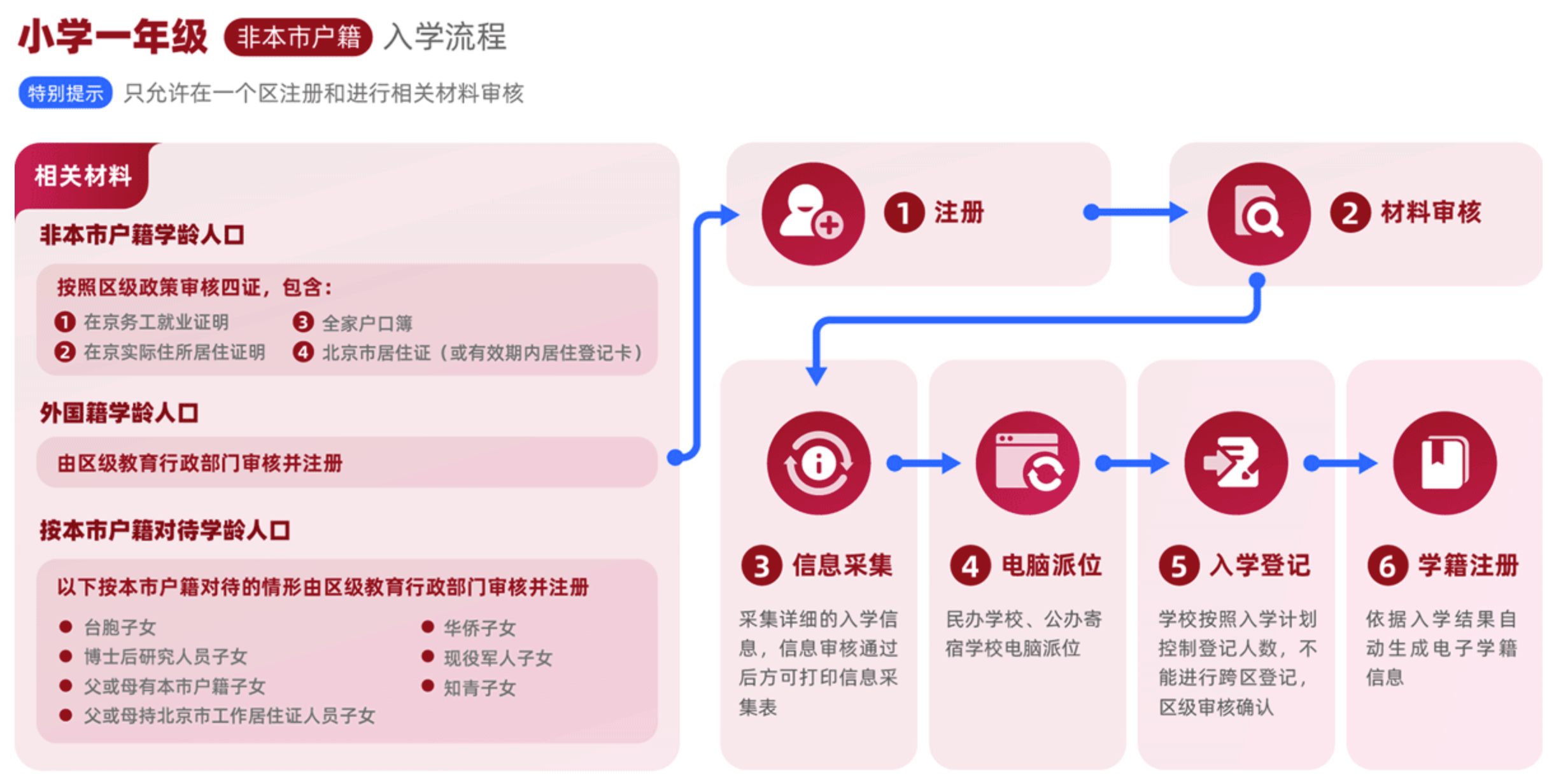 然而,随着北京流动人口增多,越来越多的随迁子女面临着义务教育阶段上学问题,其在享受优质教育资源的同时还能够与父母一起生活,不再做留守儿童。公立学校趋近饱和。2019年,异地进京上学的“五证”,减少为“四证”,不再需要户口所在地没有监护条件的证明,减轻家长往返两地奔波负担,并且在线上进行材料审核和信息采集,同样提高工作和审核效率。