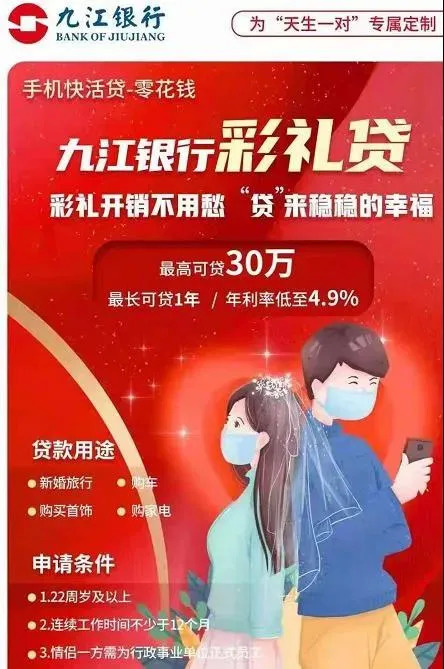 导火索是一张满溢着幸福的红色海报,海报上写着江西九江银行推出“彩礼贷”的贷款业务,宣传语是“彩礼开销不用愁,‘贷’来稳稳的幸福。为‘天生一对’专属定制。”