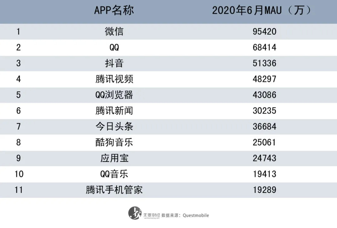 根据Questmobile统计,2020年上半年中国APP月活跃用户规模排行榜TOP30中,腾讯和字节跳动有多款产品入围,腾讯系占据压倒性优势,9款对阵字节跳动2款,尤其是微信近10亿月活,稳居首位。字节跳动旗下的抖音、今日头条分别超过5.1亿和3.6亿。