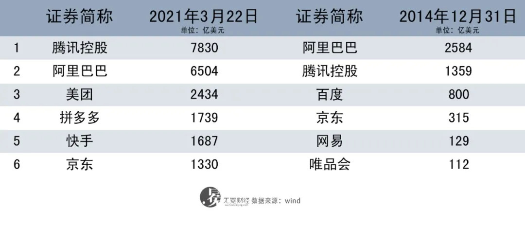 2014年5月,京东在纳斯达克上市,阿里巴巴集团9月整体上市;至年底,阿里巴巴、腾讯、百度、京东市值分别为2584亿、1359亿、800亿、315亿美元。超过千亿美元只有两家,呈现阿里和腾讯双雄格局,网易、唯品会市值也超过百亿美元。