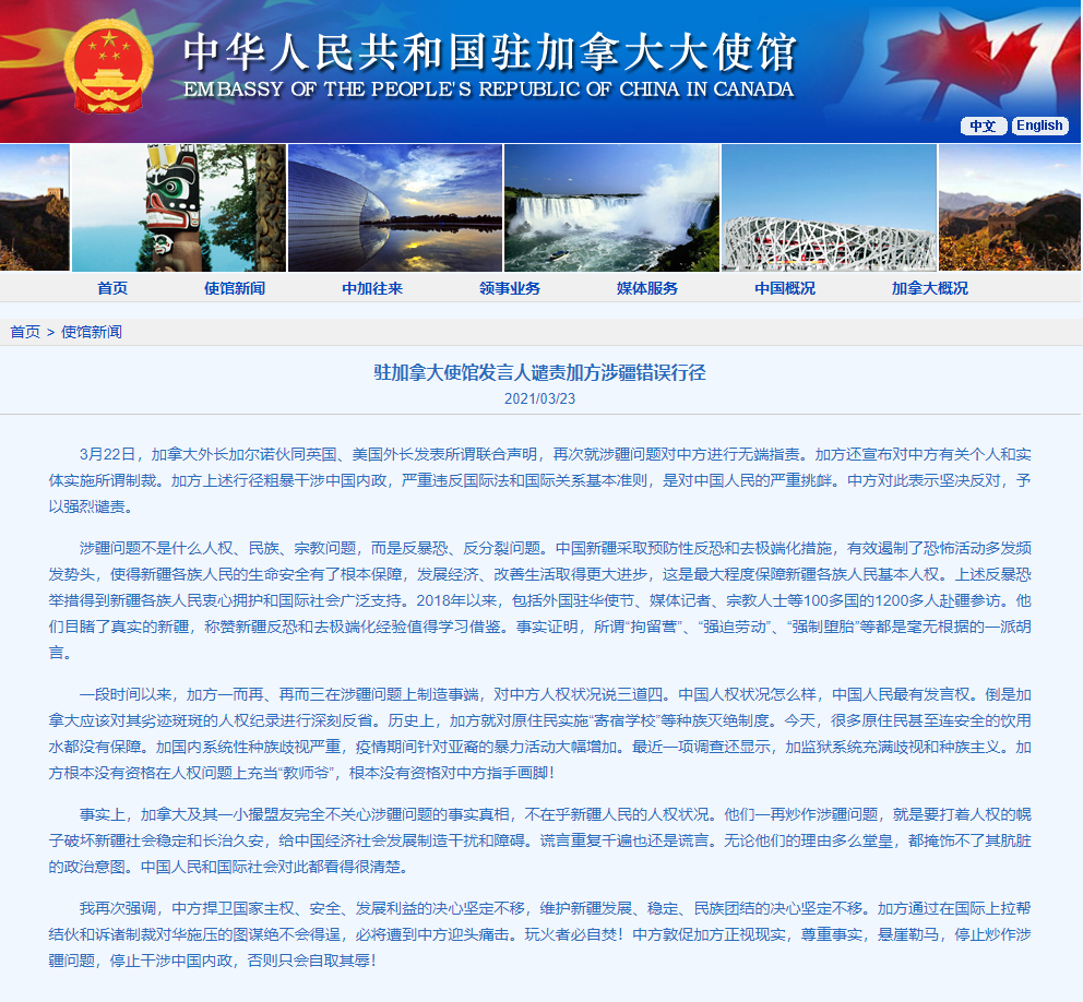 中国驻加拿大大使馆3月23日消息,3月22日,加拿大外长加尔诺伙同英国、美国外长发表所谓联合声明,再次就涉疆问题对中方进行无端指责。加方还宣布对中方有关个人和实体实施所谓制裁。加方上述行径粗暴干涉中国内政,严重违反国际法和国际关系基本准则,是对中国人民的严重挑衅。中方对此表示坚决反对,予以强烈谴责。