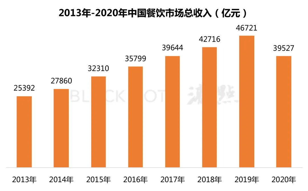 据国家统计局数据显示,2020年,中国餐饮收入为39527亿元,比2019年的46721亿元餐饮收入的餐饮收入下降16.6%。