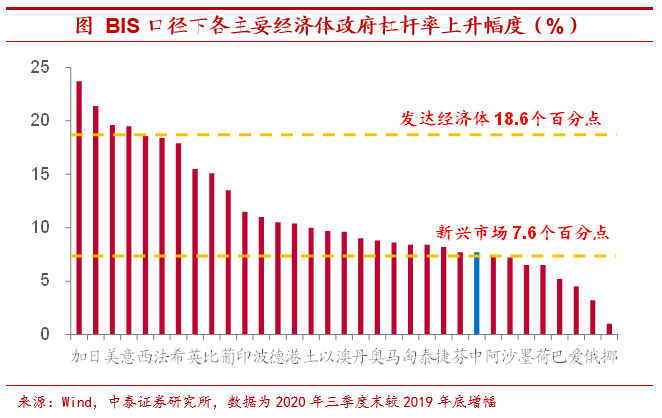 政府杠杆率上升幅度仅约为发达经济体五分之二。从上升幅度来看,根据BIS口径的数据,2020年三季度末我国政府杠杆率较2019年底提高7.7个百分点,略高出新兴经济体平均7.6个百分点的上行幅度,而发达经济体政府杠杆率上行高达18.6个百分点,约是我国的2.4倍。因此,放眼全球,我国政府杠杆率无论从绝对水平还是上升速度来看都不算高。