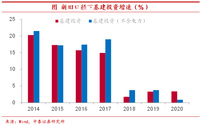 基建或仍不温不火。从2018年以来,基建投资增速持续低迷,2020年在广义财政赤字率创新高的背景下,基建投资依然表现平平,新口径下(不含电力)基建投资全年增速仅0.9%,旧口径下基建投资增速也仅有3.4%,与固定资产投资增速大体相当。而今年在政府融资整体相比去年有所收缩的情况下,虽然基建投资增速基数较低,但我们预计,全年表现或仍不温不火。