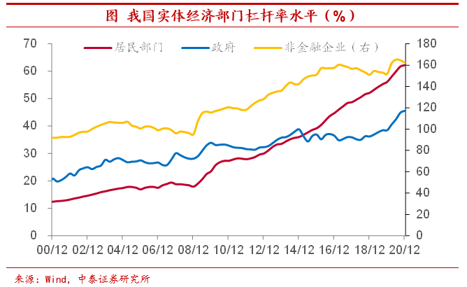 政府杠杆率仍不及居民和企业部门水平。虽然杠杆率绝对水平创下新高,但如果和其它实体经济部门相比较,我国政府部门杠杆率并不算高。根据CNBS口径的数据,2020年底我国非金融企业部门杠杆率162.3%,约是政府部门杠杆率的3.6倍,居民部门杠杆率也超过了60%,同样高出政府杠杆率的水平。