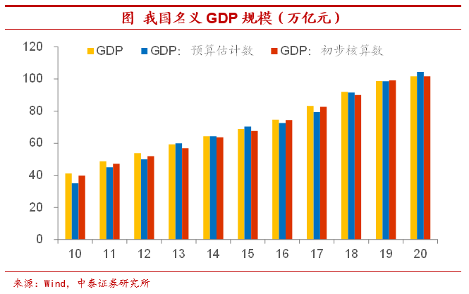 经济名义增速上限或不超12%。对于经济的名义增速,财政部在准备预算草案报告的时候会对年内GDP的规模有个大体估计。根据2021年财政预算草案报告,今年财政赤字规模为3.57万亿元,财政赤字率水平3.2%左右,对应到名义GDP规模约在11.16万亿元左右,名义GDP增速接近10%,考虑到财政预算报告对于GDP名义增速估计偏差以及四舍五入引入的误差,我们预计,年内名义GDP增速上限约在11%-12%。