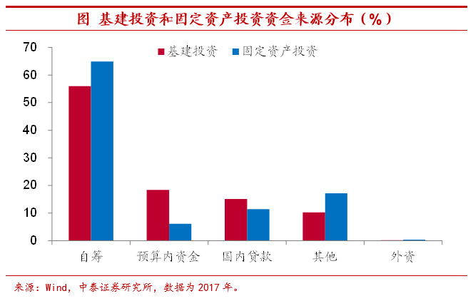 “政府降杠杆”过程中基建投资首当其冲。从投资资金的来源上看,基建投资资金中有超过15%来自于财政预算内资金,远高于固定资产投资平均6%左右的比例,而且基建投资资金来源占比最高的自筹部分,很大程度上也是来自于政府性基金、城投平台融资等广义财政资金的支持。政府杠杆率的降低无疑会影响基建融资环境,进而拖累基建投资。