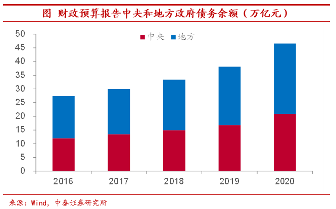 今年底政府债务规模约在46-47万亿元。对于政府债务的规模,CNBS在其宏观杠杆率季度报告中披露,2020年底政府债务余额约为46.3万亿元,全年政府债务增加8.24万亿元。这一体量和今年财政预算报告以及社融中的数据大体相当。2020年底我国社融中政府债券存量规模46.06万亿元。而据财政预算报告披露,2020年末我国中央财政国债余额约为20.89万亿元,地方政府债务余额约为26.66万亿元,合计46.55万亿元。