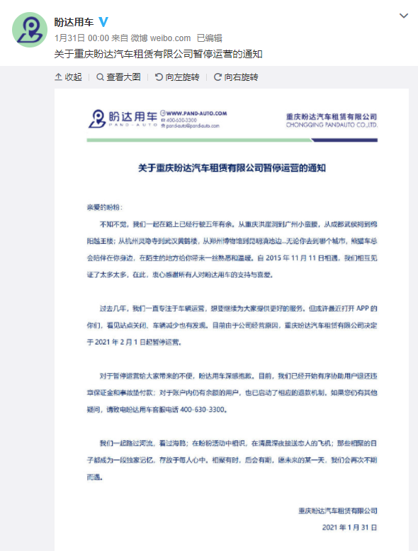 转眼三年过去了,不仅IPO梦碎,平台自身的运营都难以为继。站点关闭、车辆减少等先兆出现之后,1月31日凌晨,盼达用车发出公告,“目前由于公司经营原因,重庆盼达汽车租赁有限公司决定于2021年2月1日起暂停运营”。