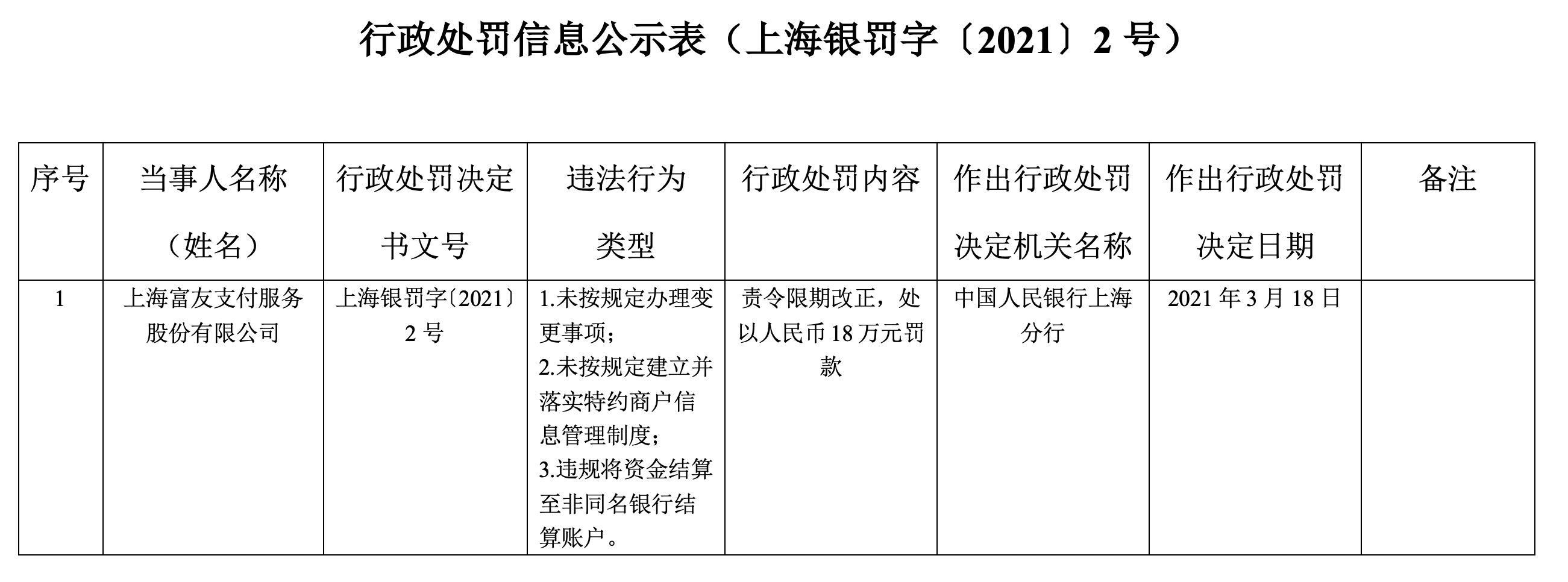 3月23日,央行上海分行发布的行政处罚信息公示表显示,上海富友支付服务股份有限公司被央行上海分行责令限期改正,并处以人民币18万元罚款。违法行为类型为:未按规定办理变更事项;未按规定建立并落实特约商户信息管理制度;违规将资金结算至非同名银行结算账户。作出行政处罚决定日期为2021年3月18日。