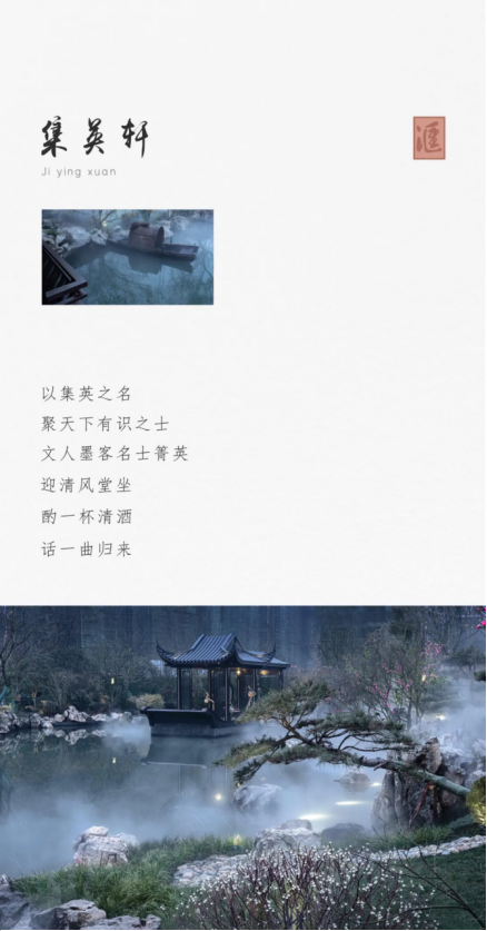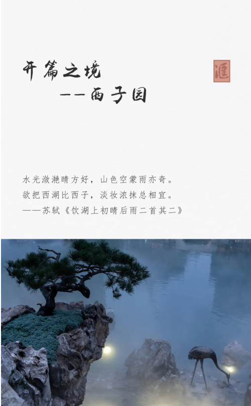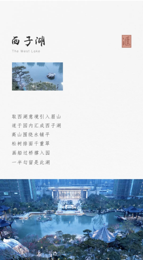 西子园,为万景·进园汇首呈之园,万景集团精心雕琢西子湖二十六盛景,提炼宋代风雅文化,解构水、山、曲于其中,破越传统中式,营造现代桃源生活。项目以“进园”为始,转“邀月台”,绕“西子湖”而行,经“状元廊”、“春风亭”、“集英轩”、“曲江盛宴”,立园意境层层递进。驻立景中,与喧嚣隔绝,仿居人间仙境。