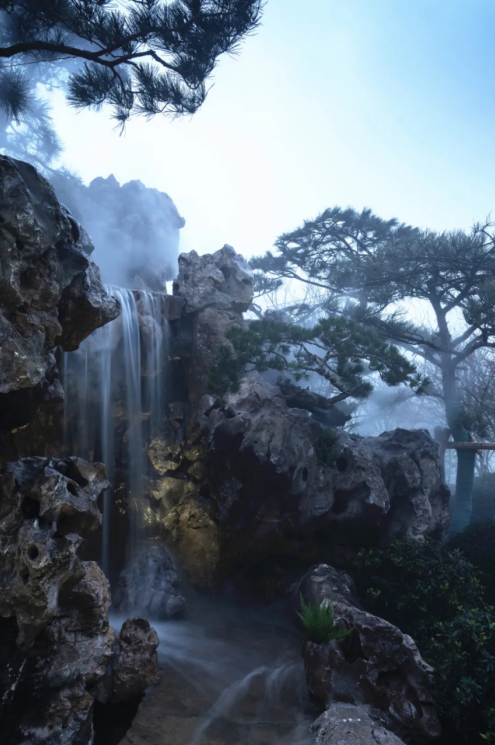 涌泉映青松,山水相融