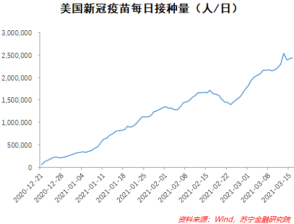一是疫苗接种速度快于预期,美国每日接种疫苗人数从年初的30万快速增加至3月16日的244万,按照当前速度,美国还有47天(到5月初)便能够实现70%人口接种的群体免疫状态,大大快于预期。由此经济重启的速度也将大大快于预期,进而推升实体经济需求增加,推升涨价压力和实际利率抬升。