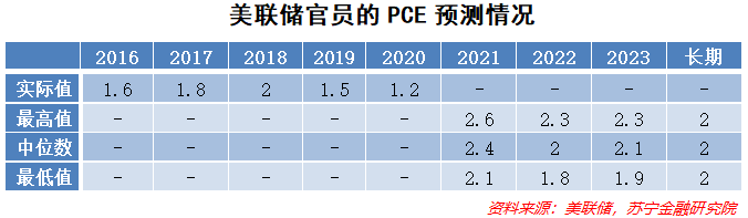 关于第3点,美联储政策框架较之前的一个比较根本性的改变是,美联储再也不像以前那样关注实时通胀数据,而是关注平均通胀率,而且美联储主要是看实际的通胀率,并不关心通胀预期,超前操作的历史已经一去不返。假设美联储从2020年3月疫情开启的时候开始考虑所谓的平均通胀率,即使按照下表中的美联储官员的PCE同比最高预测(2021年、2022年、2023年分别是2.6、2.3、2.3),也要等到2024年初才能达到美联储的平均通胀率2%的政策目标。