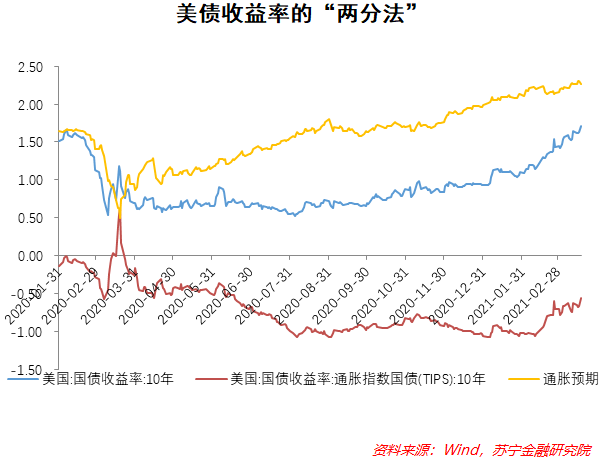 美债收益率主要由市场对通胀预期定价以及实际利率两者构成。前期的飙升,主要受到通胀预期的影响,实际利率并未明显抬升。以美债10年期收益率减去通胀保护债券(TIPS)衡量的通胀预期快速上升,接近2013年以来的高点。但近期通胀预期稳定后,实际利率又持续抬升,继续推升美债收益率走高。