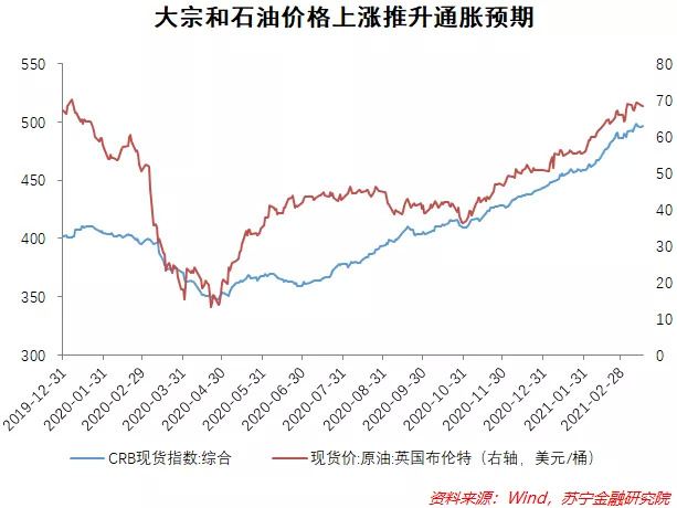 二是实体经济改善和交易因素促使的大宗商品涨价,推升实际通胀和通胀预期同时走高。美国CRB现货指数自2020年下半年开始持续上涨,已经回到全球疫情之前的水平。同时,与中国之于铜价类似,美国通胀率对油价的敏感程度很大,油价和大宗工业品持续上涨推升美国通胀预期以及真实通胀的抬升。