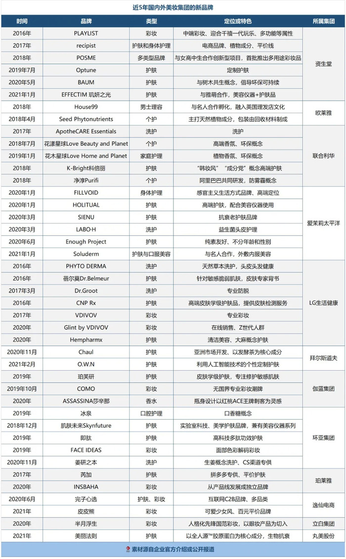 按品牌的具体归属来看,国外的资生堂、爱茉莉太平洋、LG生活健康、联合利华,国内的环亚集团最为“疯狂”,单个集团推出的新品牌数量均不下5个,这五大集团总共为行业贡献了近30个新品牌。此外,就连在推新品牌方面向来谨慎的拜尔斯道夫、伽蓝集团、丸美股份也按捺不住了。