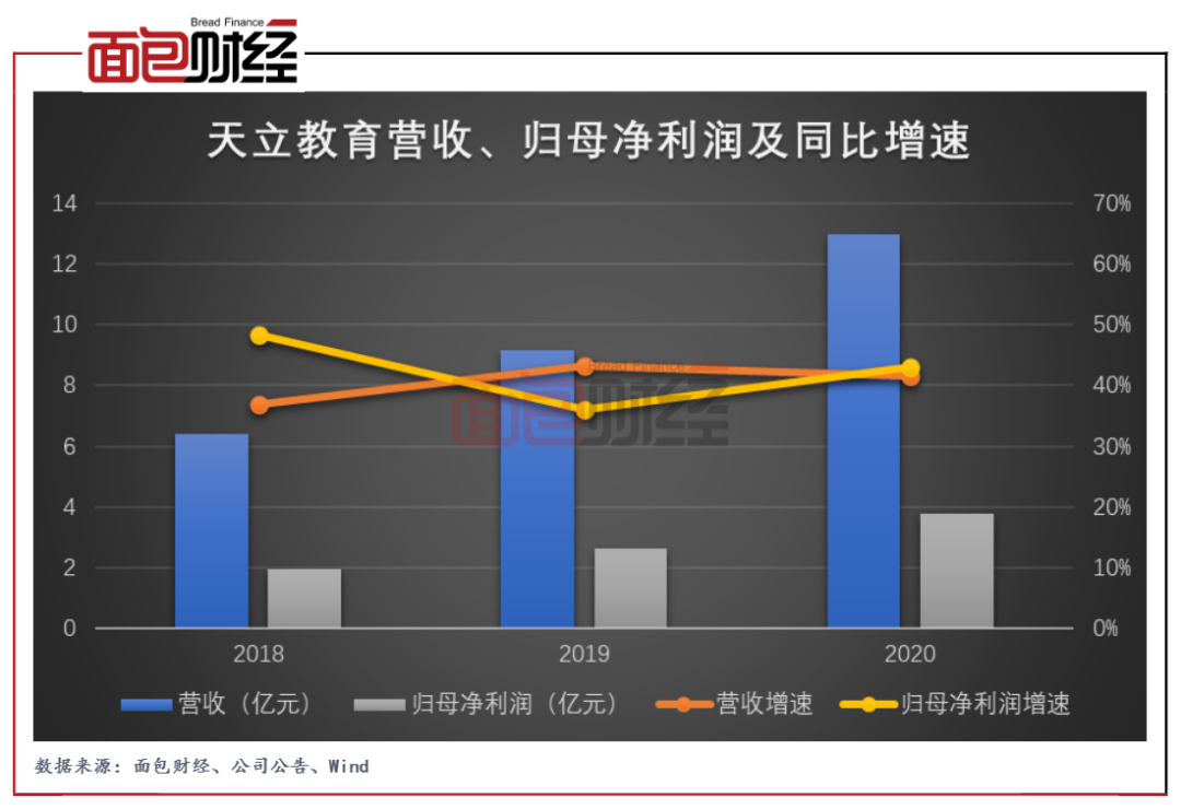 2018年至2020年的三年间,天立教育营业收入从6.41亿元上升至12.98亿元、归母净利润从1.95亿元上升至3.79亿元,年均复合增速分别达到42.30%和39.41%。其中,公司2020年的营收、归母净利润增速分别为41.46%和42.97%,维持较快增长趋势。