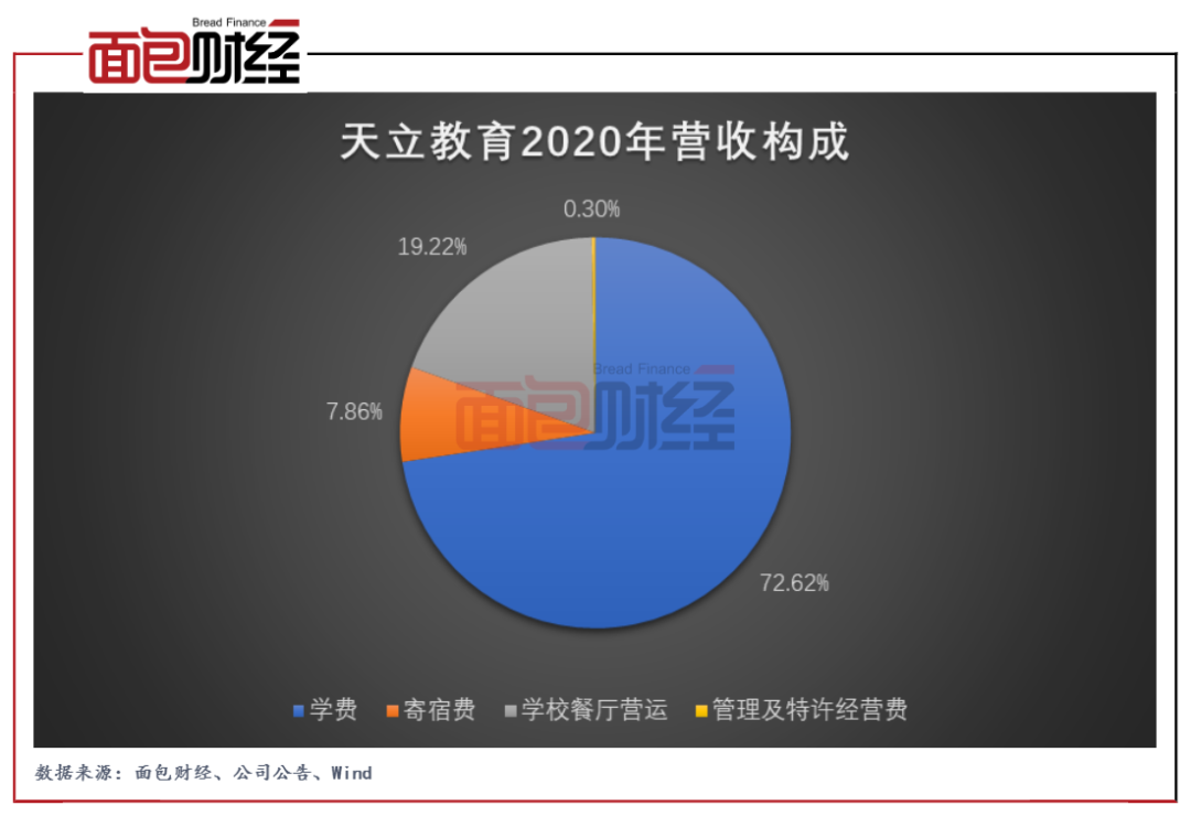 拆分收入构成来看,天立教育的营收来源包括学费、寄宿费、学校餐厅营运收入、管理及特许经营费。2020年,公司来自于学费和寄宿费的营收占比合计超过八成,构成了公司最主要的收入来源。此外,学校餐厅营运收入约2.49亿元,营收占比为19.22%。