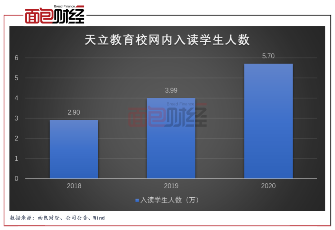 2020年,天立教育业绩较快增长受益于入读学生人数增加以及整体学费上升。数据显示,截至2020年12月31日,共有约5.70万名学生入读天立教育校网内自有及委托K-12学校,同比增长42.8%。学生增长来自于现有K-12学校以及新开班的自有K-12学校入读人数增加。