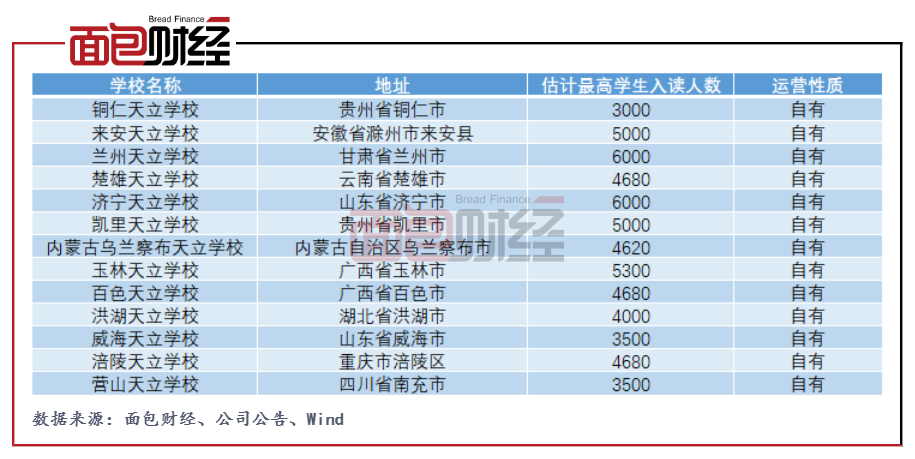 2020年,天立教育就开办K-12学校订立10份协议并于报告年度后订立另1份协议。财报显示,公司目前已签署协议并将于未来年度开办的学校累计已达到13所,分布于贵州、安徽、甘肃、云南、山东、内蒙古、广西等省份。