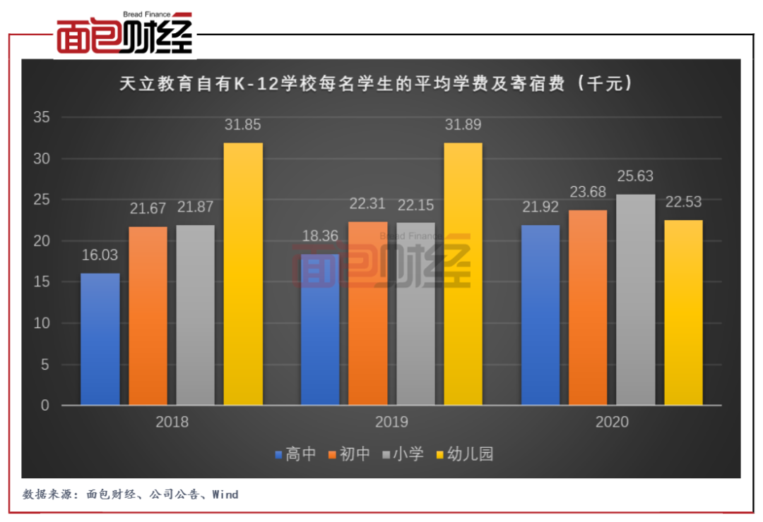 财报显示,天立教育2020年自有K-12学校高中、初中、小学和幼儿园学段每名学生的平均学费及寄宿费分别为21.92千元、23.68千元、25.63千元和22.53千元。除了幼儿园学段,其他学段2020年的平均学费及寄宿费均明显上升。