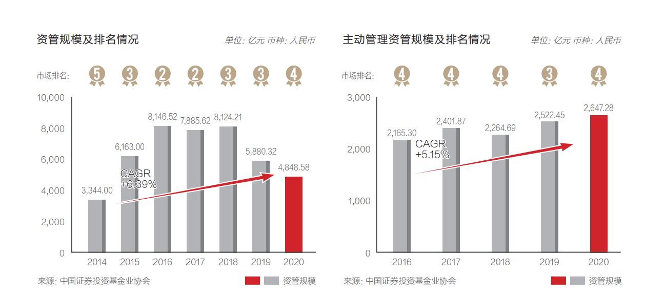 私募整体数据来看,根据中国证券投资基金业协会公布的最新数据,2020年华泰资管私募资产管理月均规模为4848.58亿元,位列第四,被招商资管超过;私募主动管理资产月均规模2647.28亿元,同样被招商资管超越,跌出行业前三,位列第四。