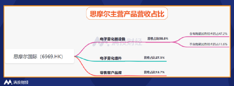 不要急,电子烟的销售形式主要分为国内市场和海外市场,而目前国内主要的电子烟代工厂主要以国外销售为主,国内市场销售偏低。从电子烟代工龙头思摩尔国际(6969.HK)来看,2019年主营产品分别为电子雾化器设备(占总营收58.8%)其中含有陶瓷加热技术的占47.2%,不含陶瓷加热技术的占11.6%、电子雾化组件(占总营收27.5%)、面向零售客户品牌APV13.7%。