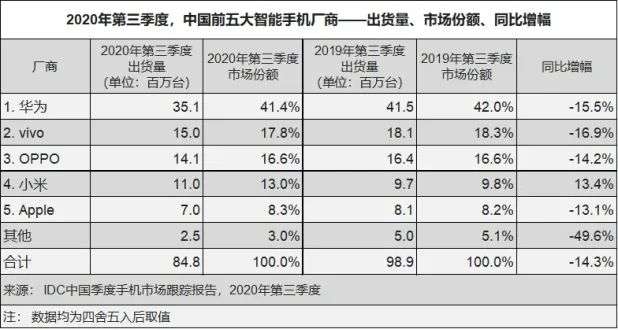 受疫情影响,2020年三季度主流手机厂商的出货量都出现了同比下降10%-15%左右,但是Others手机厂商的阵营数据则同比下降近50%。