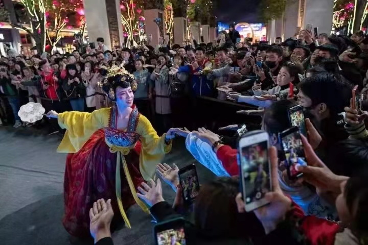 那么,西安的夜经济到底能带动多少产业的发展?我们看图说话,在大雁塔南广场,如果想要一睹不倒翁小姐姐的芳容,可能得排上好几个小时的队,穿过十几层密密麻麻的人群,可能才能看上一眼。那个人潮,真的是潮啊。