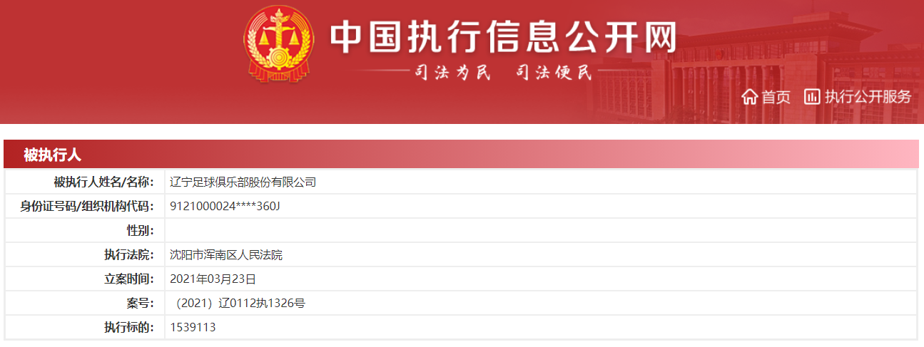 据中国执行信息公开网,3月23日,辽宁足球俱乐部股份有限公司新增一条被执行人信息,案号(2021)辽0112执1326号,执行标的为1539113元,执行法院为沈阳市浑南区人民法院。