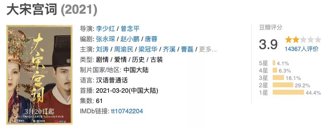 《大宋宫词》3.9分到底冤不冤?读娱君认为,如果一部剧并未呈现出特别严重的两极分化粉黑之争,那么评分至少真实反映出了大部分观众的情绪。如果考虑全方面客观理性来说,《大宋宫词》显然并不像其他3、4分剧那么粗制滥造,有自己的优点;但如果从当下普通观众的“观感”来说,《大宋宫词》的的确确就是“观感糟糕”的那一类,观众弃剧的念头恐怕来得相当快。