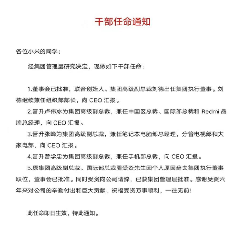其中,卢伟冰接任周受资接档小米国际部总裁,同时获得晋升为集团高级副总裁,兼任中国区总裁、国际部总裁和 Redmi 品牌总经理,向CEO 汇报。