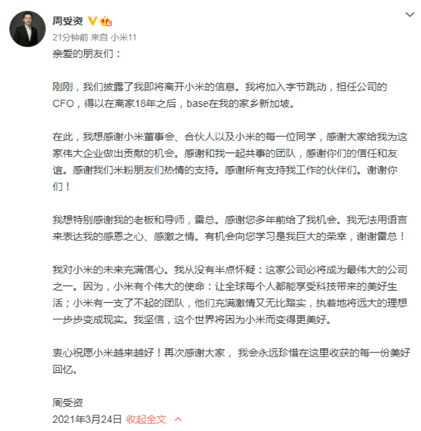另一边,小米高管人事动荡。原集团高级副总裁国际部总裁,一手操盘了小米在港上市的周受资,从小米离职。周受资同日宣布,将加盟字节跳动任CFO。