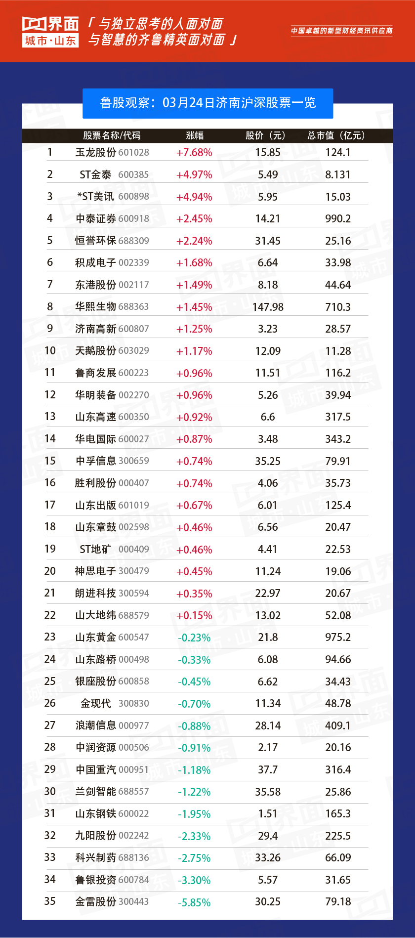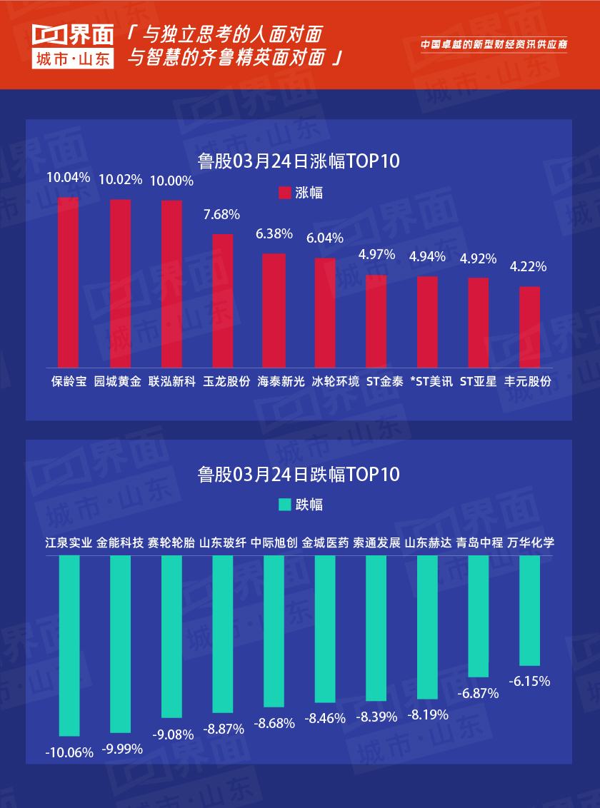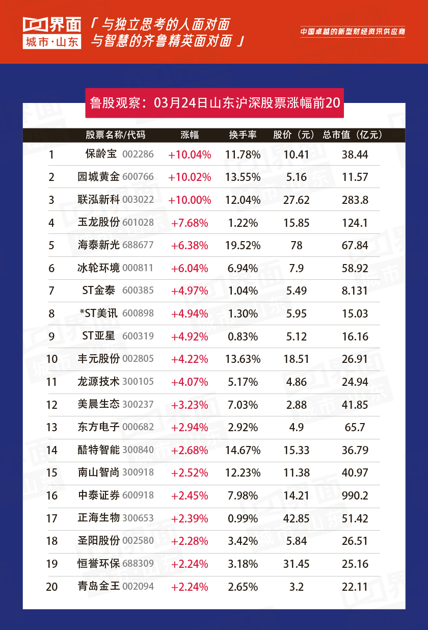 3月24日,山东83股上涨,142股下跌。