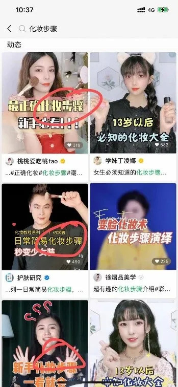 像这些博主的标题中都有“化妆步骤”,所以有此需求的用户搜索关键词后就会首先看到他们,一眼就清楚他们视频内容的主题是什么,就会接着点开视频观看。