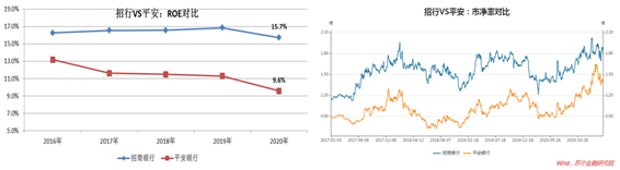 用PB-ROE指标来衡量,招行的ROE(净资产收益率)显著优于平安,市场也给予其更高的市净率水平。以2020年为例,招行加权ROE为15.7%,平安为9.6%,落后6.1个百分点。传导至估值层面,过去四年中,招行市净率平均高出56%。