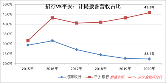 2020年,平安银行计提减值拨备704亿元,营收占比为45.86%;同期招行计提拨备650亿元,营收占比仅为22.37%。从下图可知,自2016年以来,平安银行的计提拨备占比显著高于招行。
